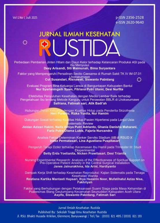 Vol 12 No 2 (2025)Jurnal Ilmiah Kesehatan Rustida (p-ISSN: 2356-2528, e-ISSN: 2620-9640) published twice a year (January and July ) by Akademi Kesehatan Rustida, Indonesia Jurnal Ilmiah Kesehatan Rustida contributes to the dissemination of information related to nursing and health science research. The scope of this journal is broadly multi-perspective in health areas of nursing and midwife such as Nursing Education, Clinical Practice, Community Health Care, Management and Health System, Health Informatics, and Transcultural Nursing, Mother and Child Health Care, Health Reproduction with a focus on urban nursing issues in low-middle income countries. Jurnal Ilmiah Kesehatan Rustida is committed to communicating and being open to the discussion of ideas, facts, and issues related to health across a wide range of disciplines.
